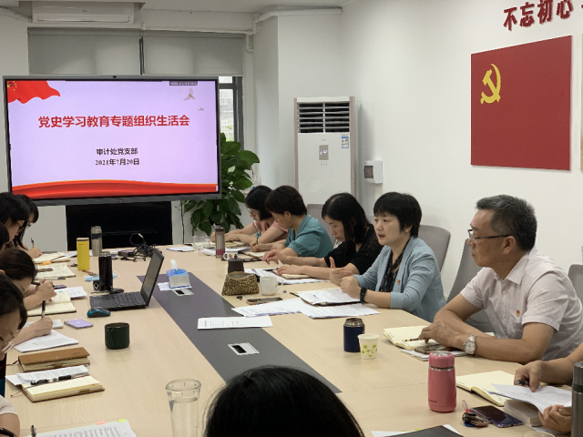 会上,顾凌云代表党支部委员会向党员报告半年来支部工作情况特别是开展党史学习教育情况。她指出,审计处党支部高度重视,加强组织领导,扎实推进党史学习教育,先后开展了4次专题集中学习研讨,组织4次专题党课学习,召开2次专题座谈会深入学习领会习近平总书记在庆祝中国共产党成立100周年大会上的重要讲话精神,举办了1次主题党日活动。党支部开展了审计案例教材编写、深入基层调研座谈、上门送制度宣讲等“我为群众办实事”系列活动,并通过专人导读、口述党史接龙、观看《百炼成钢》等党史纪录片、党史知识抢答、唱红歌、诵红诗、讲述红色故事、情景剧展示等多种形式进行学习交流,有效提升了学习效果。党支部坚持党建引领业务,带动全处从党史学习中汲取精神力量,进一步坚定信念,凝聚共识,推动审计工作攻坚克难,取得新成效。随后,顾凌云通报了党支部委员会检视问题情况,并带头开展批评和自我批评。参会党员联系思想和工作实际,逐一检视自己在党史学习教育中的感悟和收获,互相查找差距和不足。通过坦诚交流、批评帮助,达到了团结-批评-团结的目的。